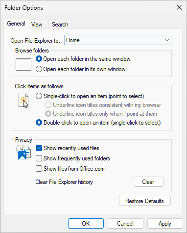 Bước 2: Tại dòng Open File Explorer to chọn Home -> Apply -> OK